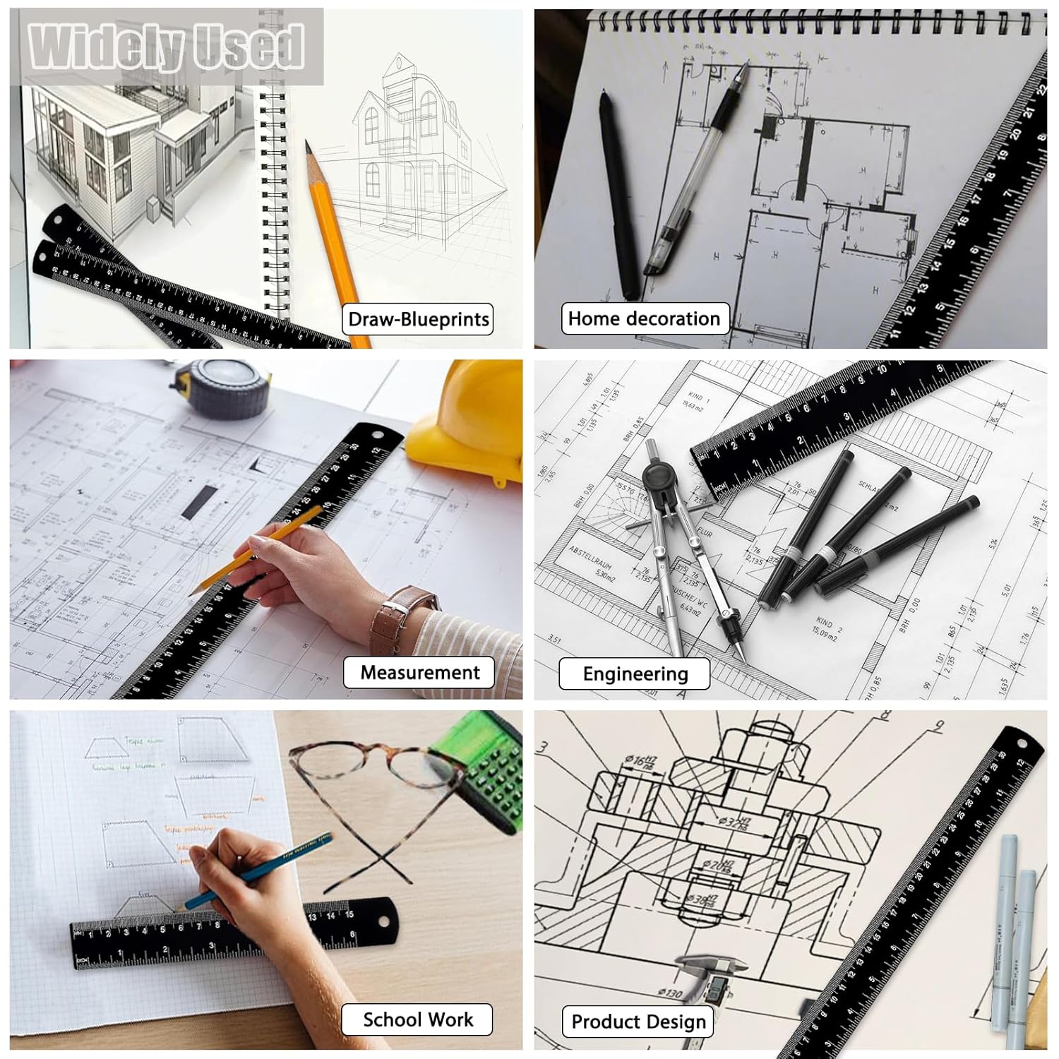 - 【Multi-functional Rulers】: The metal ruler makes it easy to draw straight lines on any and all art, blue prints, drawings, and projects, widely used in daily life, school, office, construction sites, decoration workshops, drawings and paintings, scientific experiments, etc.