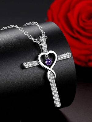 Women's Cross Encrusted Zircon Pendant Love Shaped Birthstone Necklace