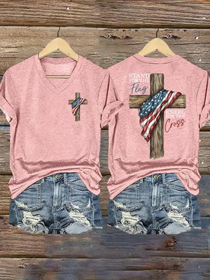 Women's Stand For The Flag Kneel For The Cross Printed Casual V-Neck T-Shirt